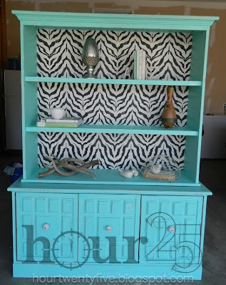 This cabinet got a complete overhaul and went from being a sad, neglected eyesore to a superstar! I used a bright turquoise latex paint and found this amazing zebra wallpaper at Lowe's to finish it off... I was a little nervous to do something so dramatic, but I know that someone out there will love this piece and find the perfect spot for it to shine. I think it would be great in a bedroom, in a fun livingroom or dining room or in an office as a book shelf. The open shelving with a plate groove makes it perfect for display, books or any type of funky collection. Lots of closed storage makes it practical too!